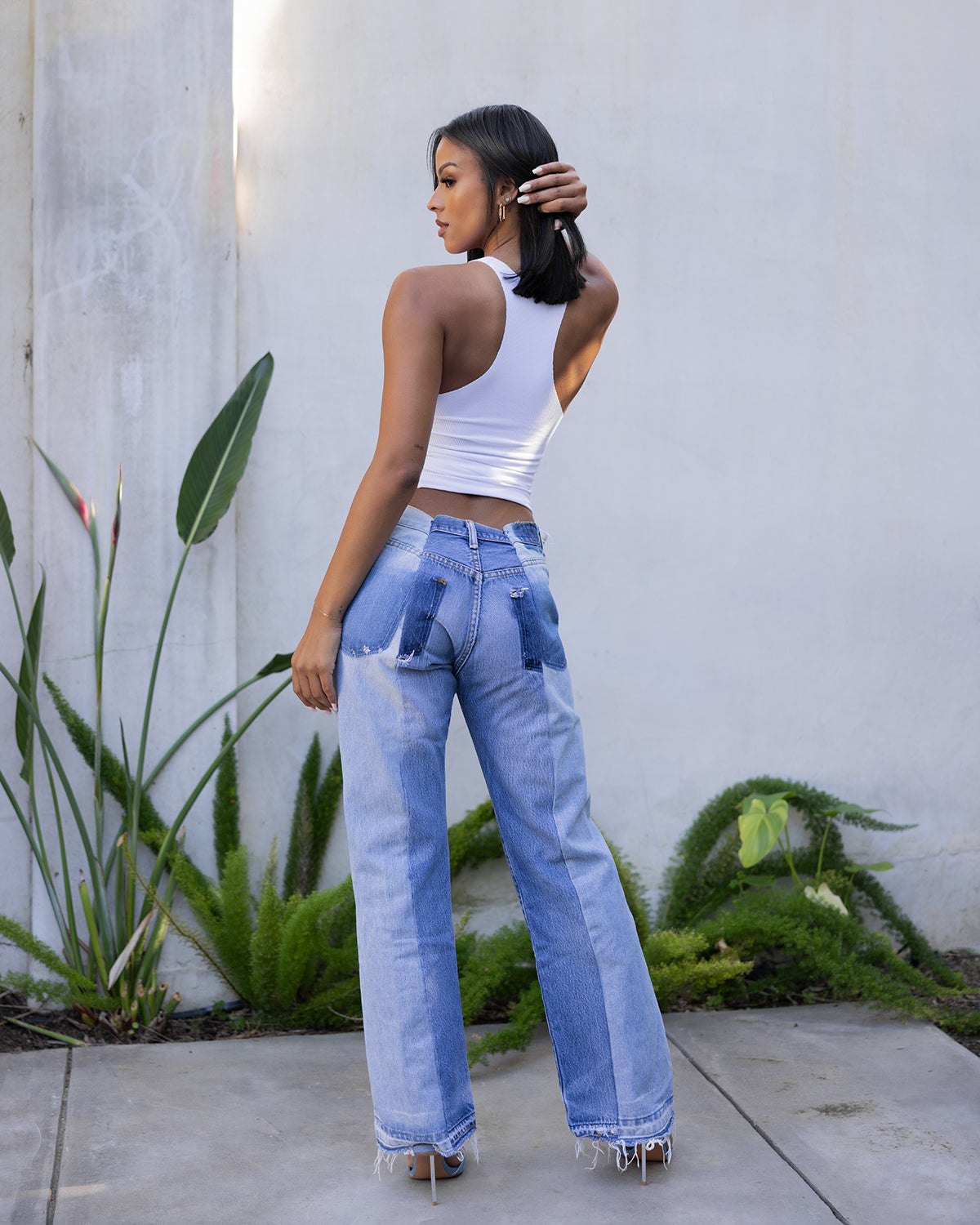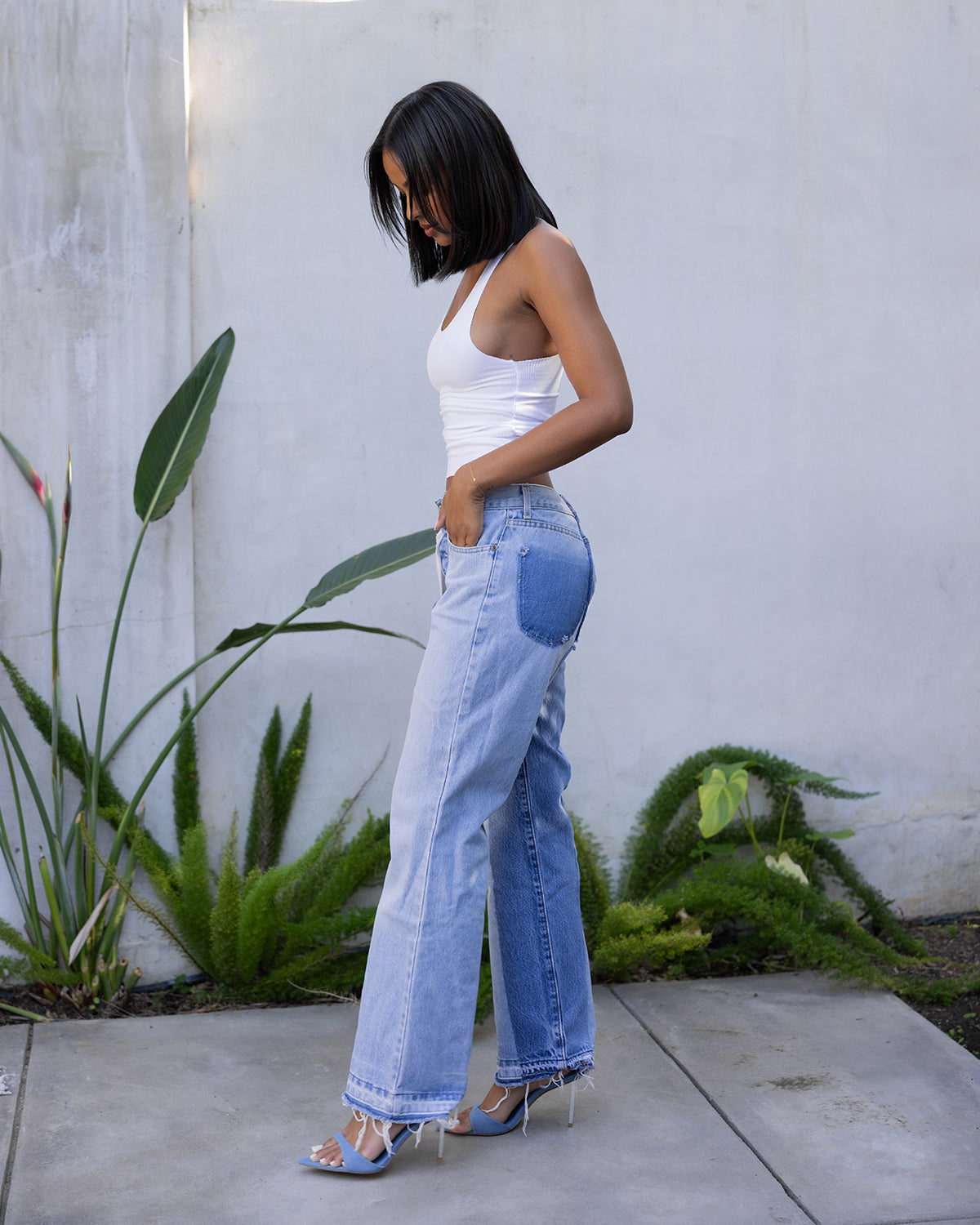 This reworked jean features two-tone panels, a raw hem & exposed pocket. Each one pair is unique, wash of denim will vary.