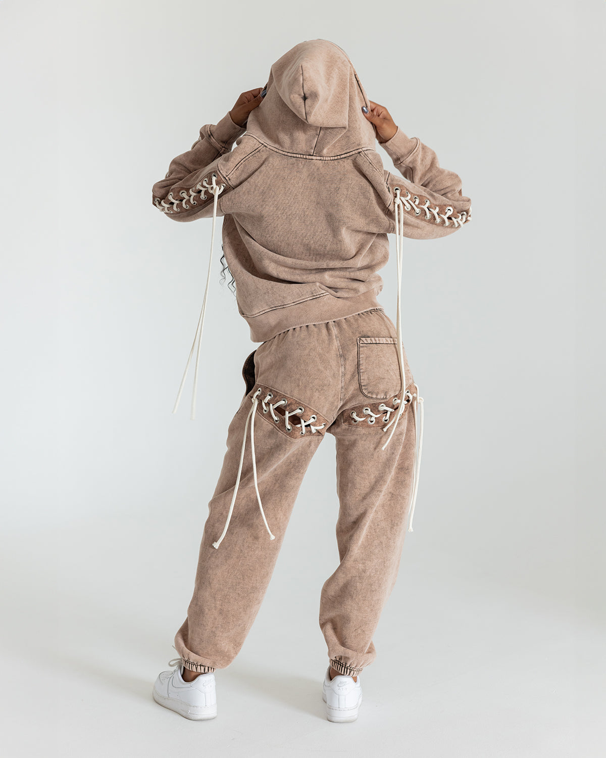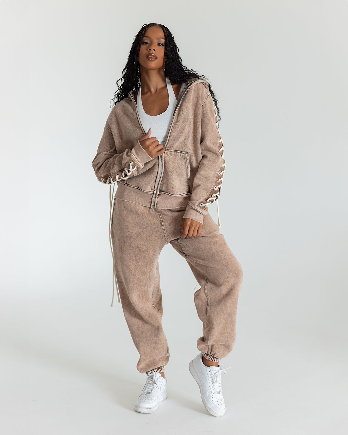 The Aspen hoodie in Chai features lace-up grommet detail from cuff to shoulder with a relaxed fit and full zip closure into the hood. 'Chai' is a cool, nude with our classic bone cord. Hand dyed in LA.