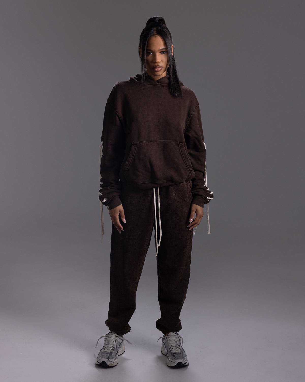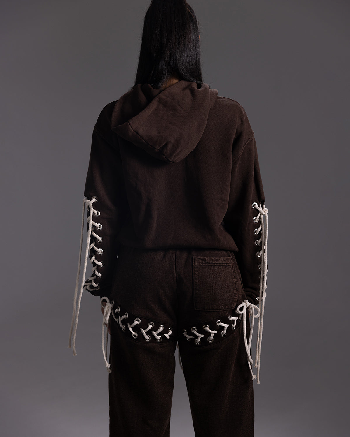 The Aspen hoodie in Cocoa features lace-up grommet detail from cuff to elbow with a naturally relaxed/loose fit.