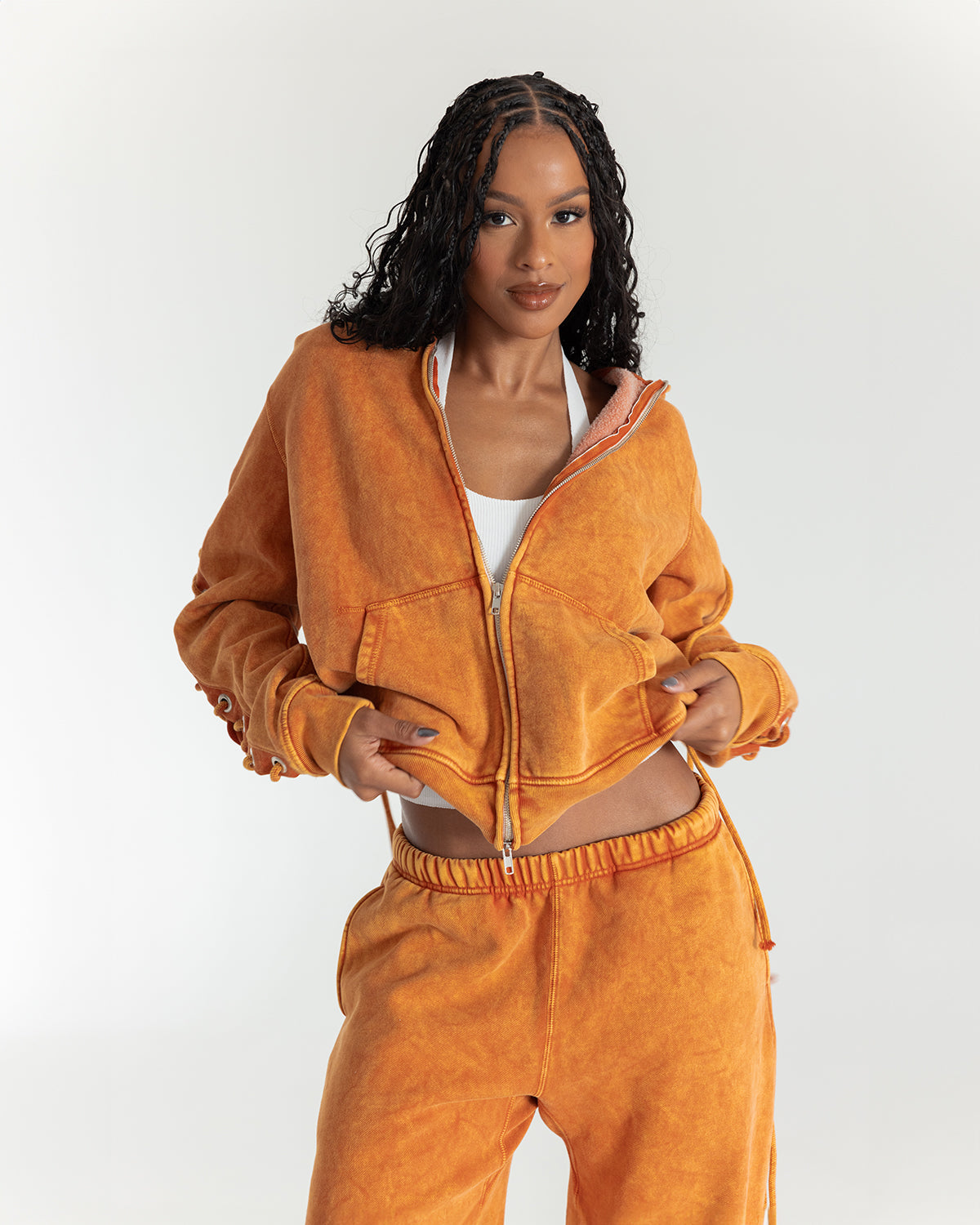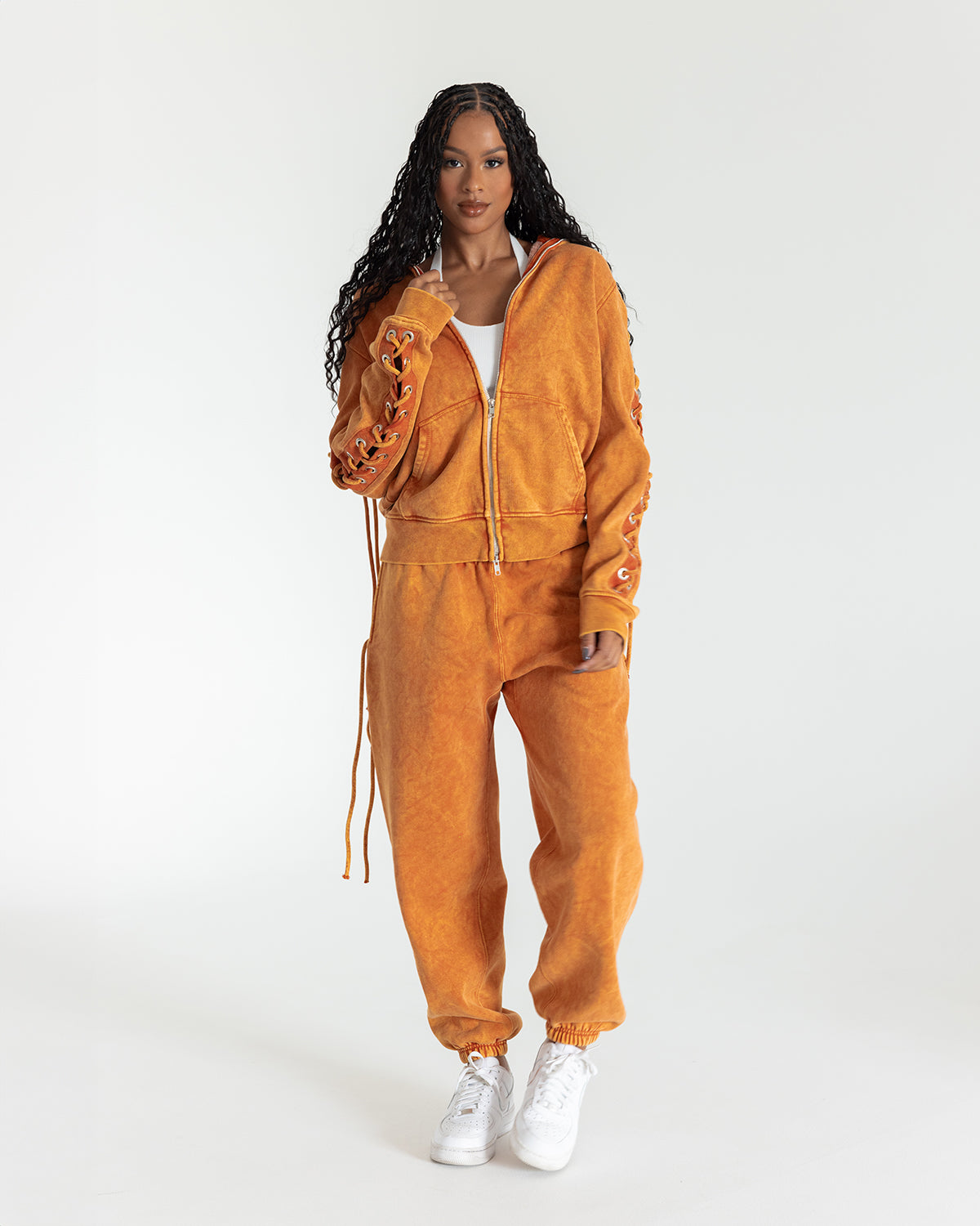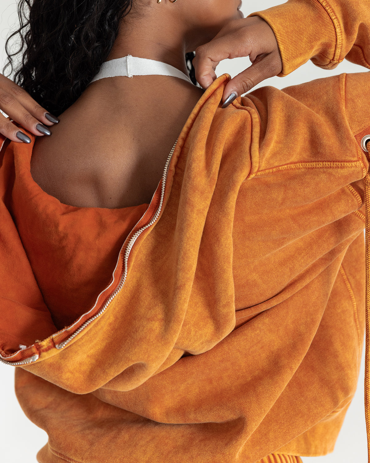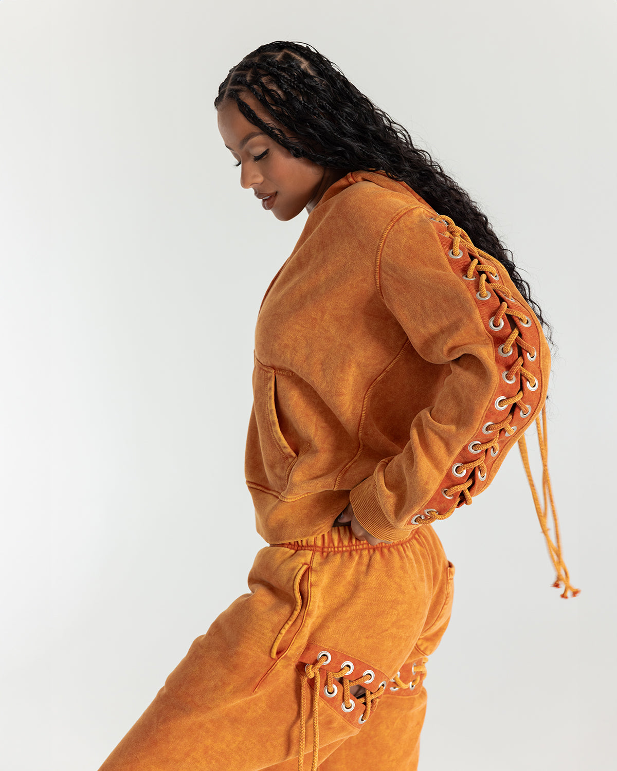 The Aspen hoodie in Spice features lace-up grommet detail from cuff to shoulder with a relaxed fit and full zip closure into the hood. 'Spice' is a warm, burnt orange with cording to match. Hand dyed in LA.