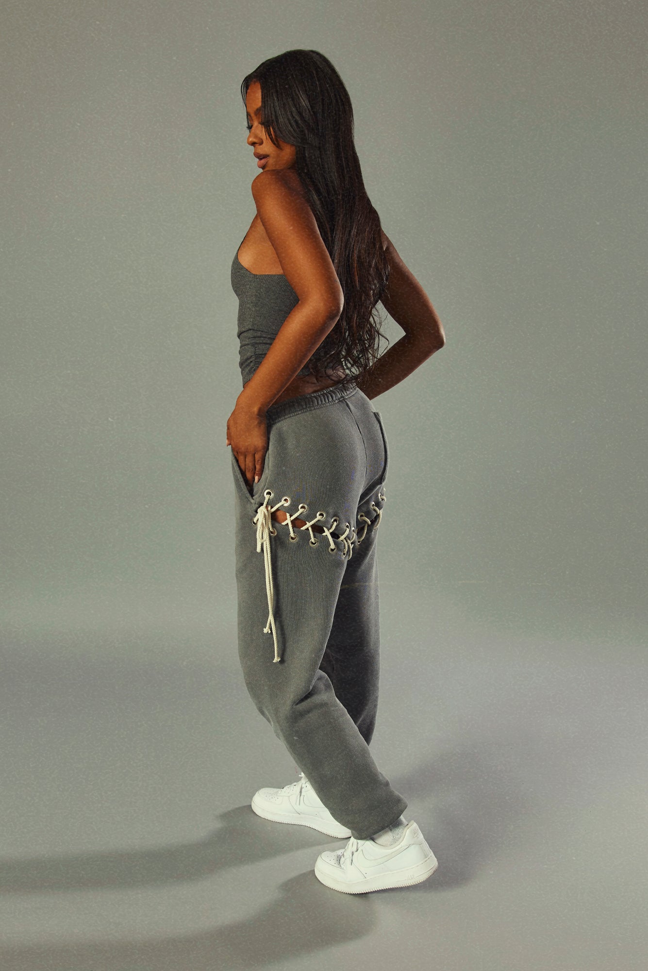 The Aspen sweats in Storm features lace-up grommet detail under the butt with a naturally relaxed/looser fit.