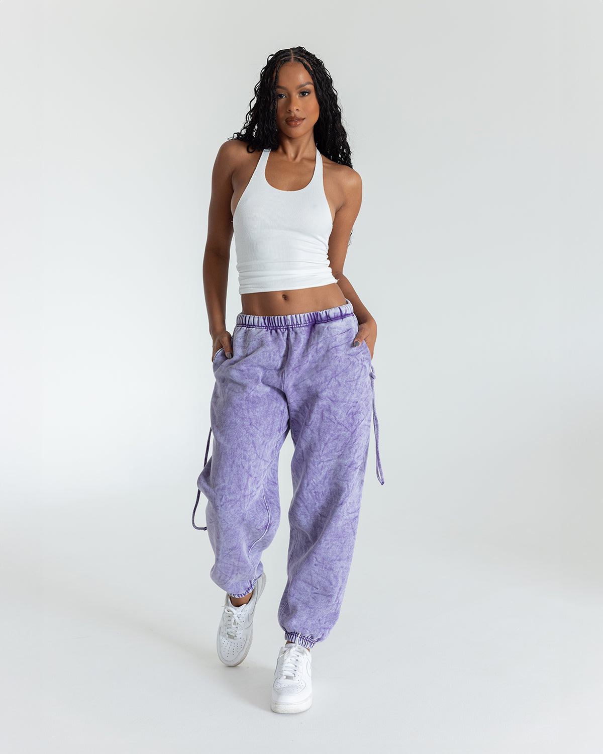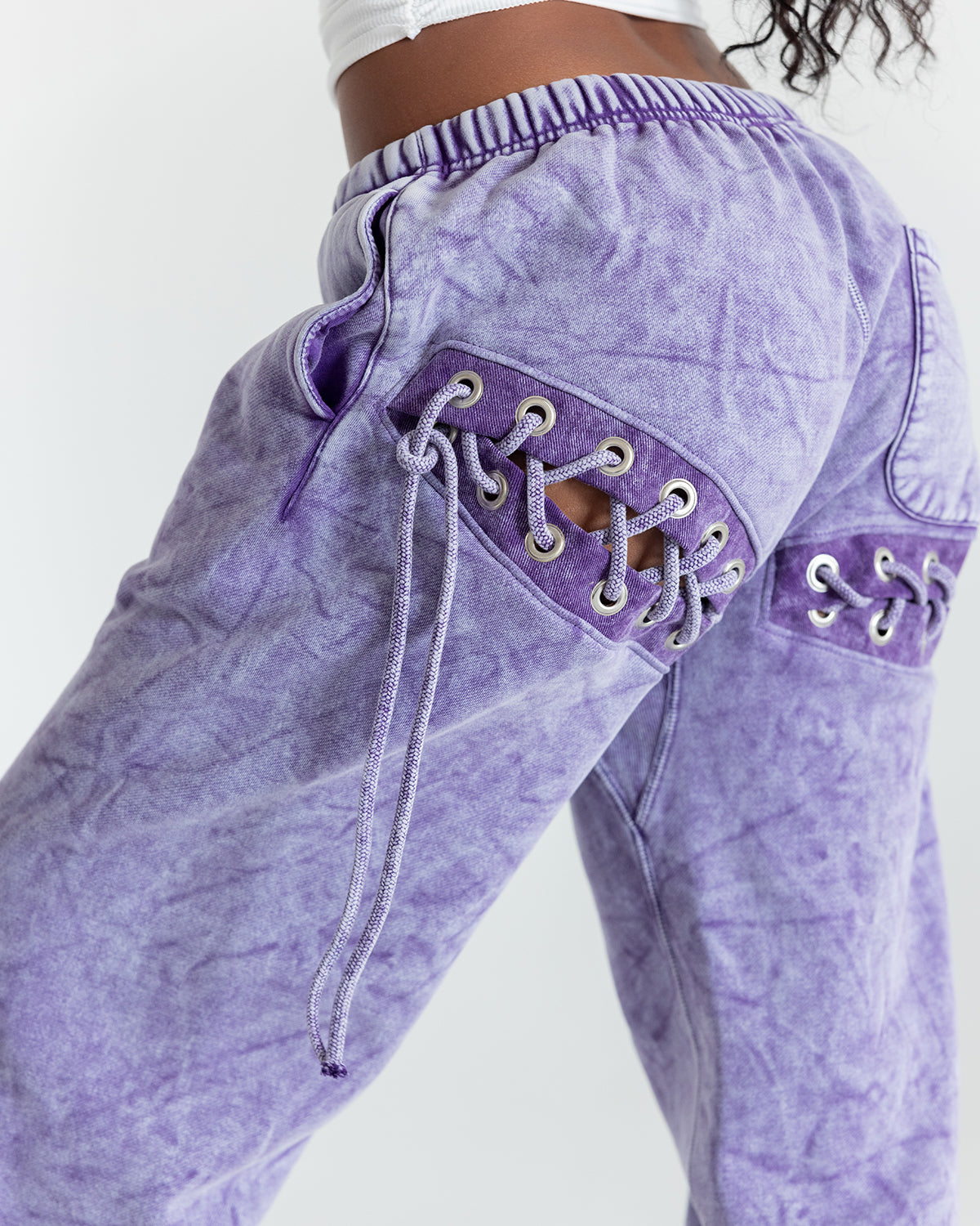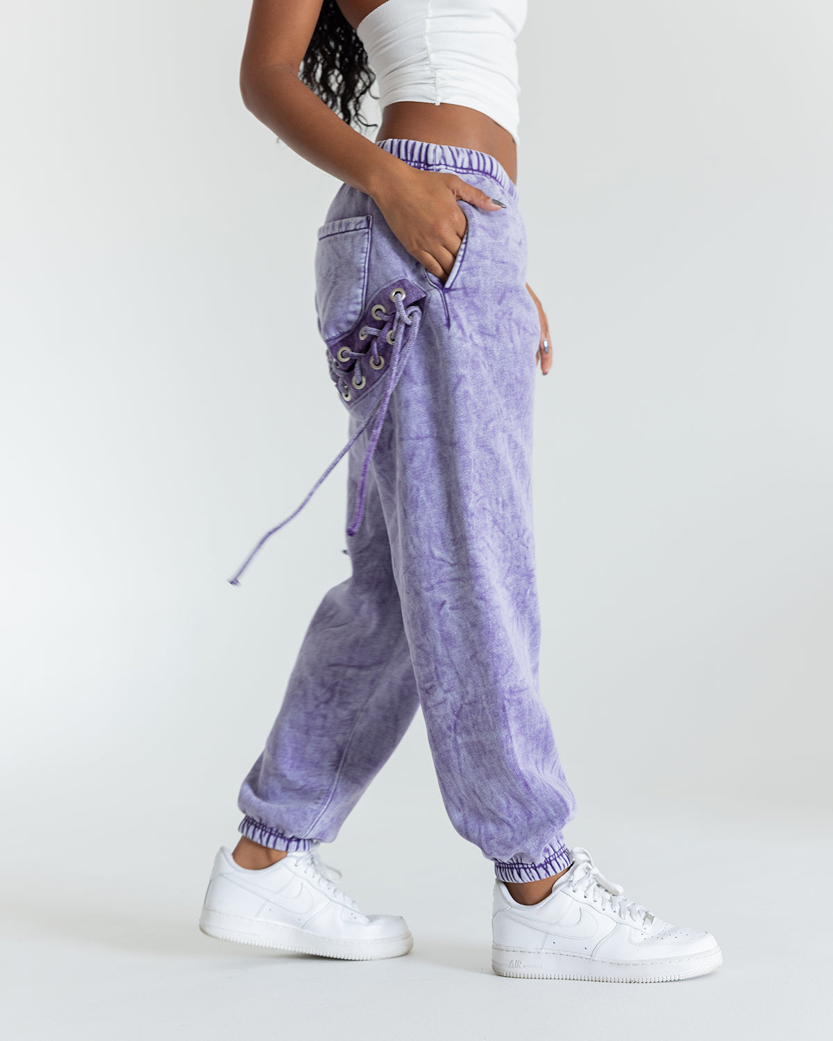 The Aspen sweats feature lace-up grommet detail under the butt with a naturally relaxed fit. 'Berry' is a rich, lavender with cording to match. Hand dyed in LA.