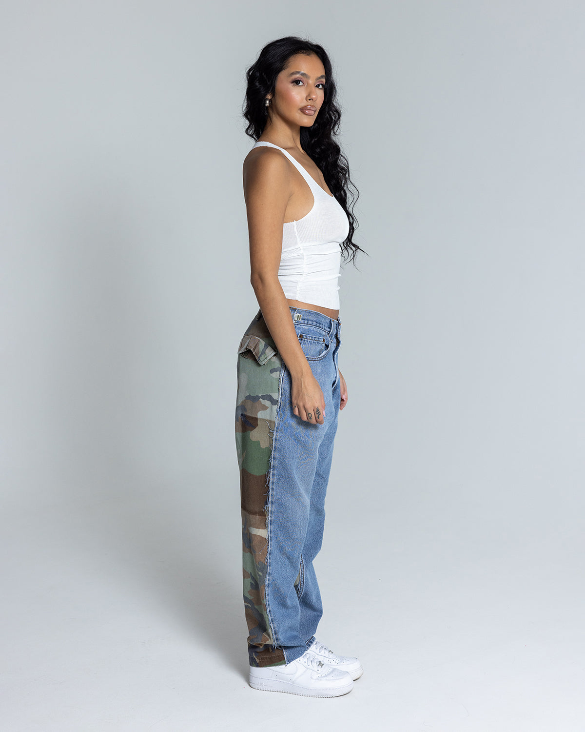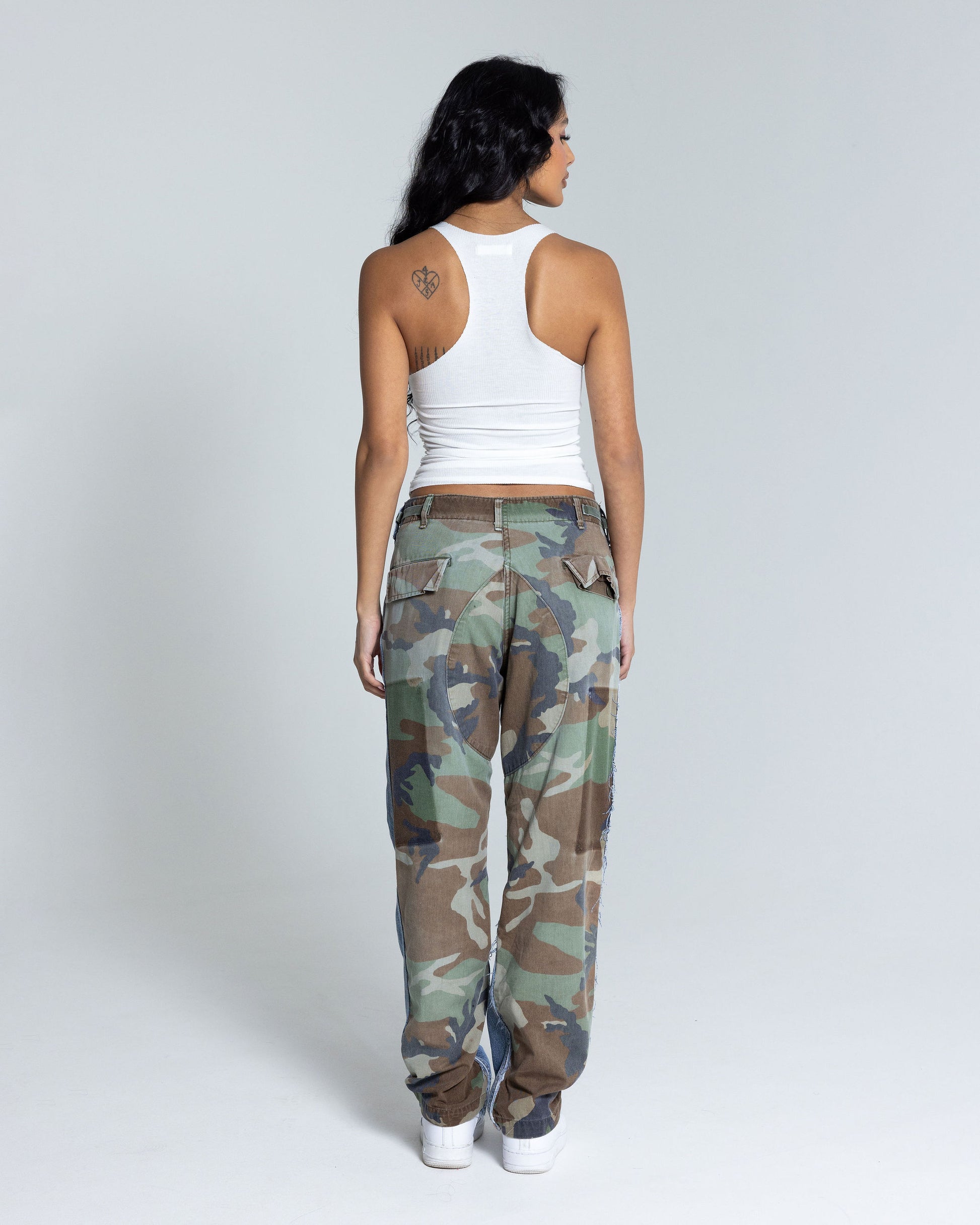 Reworked vintage pant features a two-panel denim, camo pant. Customize yours by waist and inseam. Each one is unique, denim wash/camo will vary.