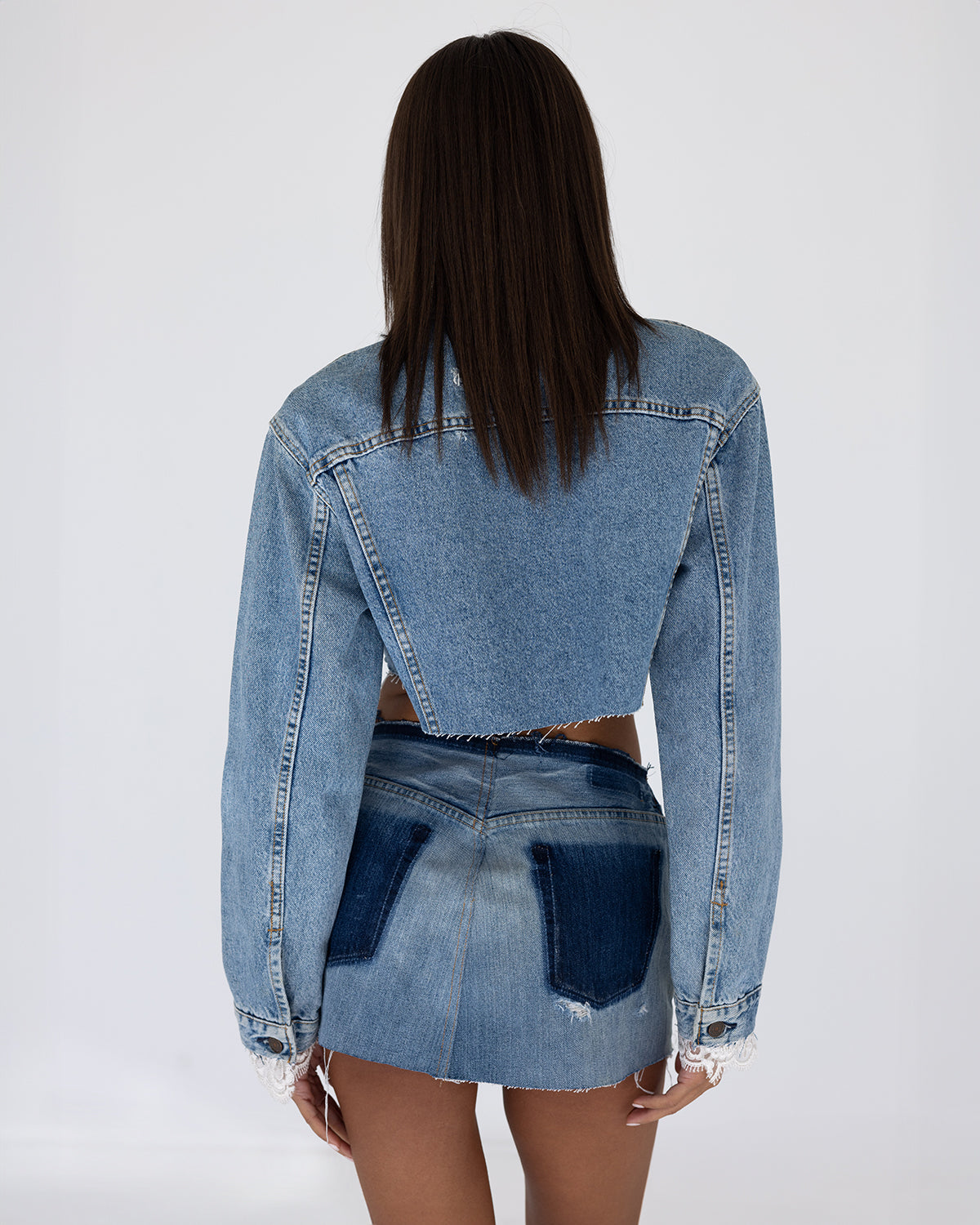 This cropped denim jacket features lace trim cuffs and light distressing. Made from re-worked vintage denim. Each one is unique and denim wash will vary.