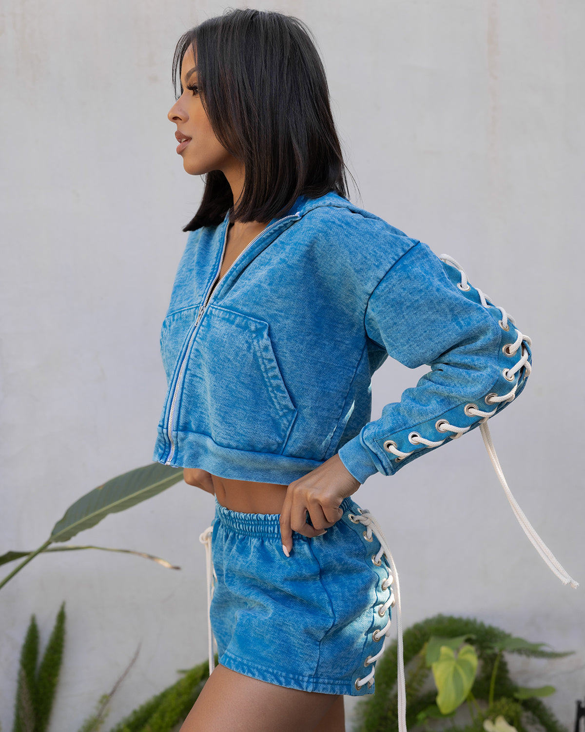 This zip up hoodie features lace-up grommet detail along the arms with our signature bone string and has a relaxed, cropped fit.