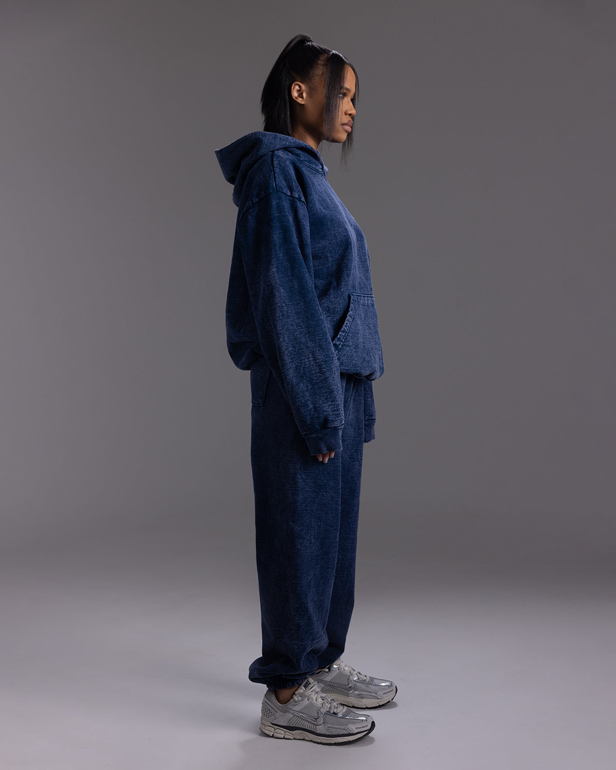 Classic pullover hoodie with SL logo, made of 100% cotton fleece with a vintage blue, enzyme wash.