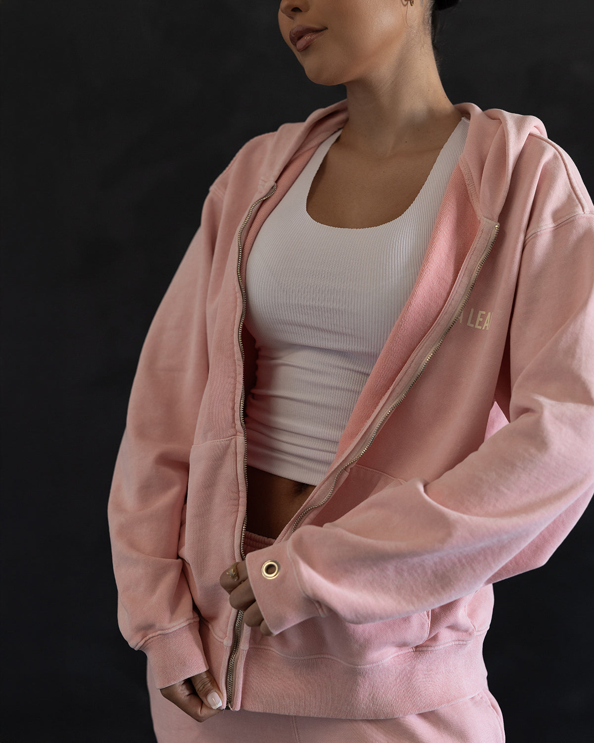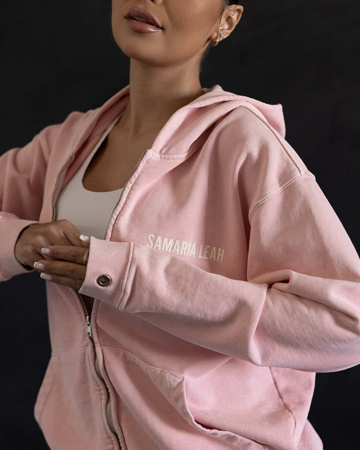 The sl logo hoodie in 'shortcake' features a an oversized full zip hoodie with grommet detail on the cuff. Hand dyed to a vintage washed baby pink.