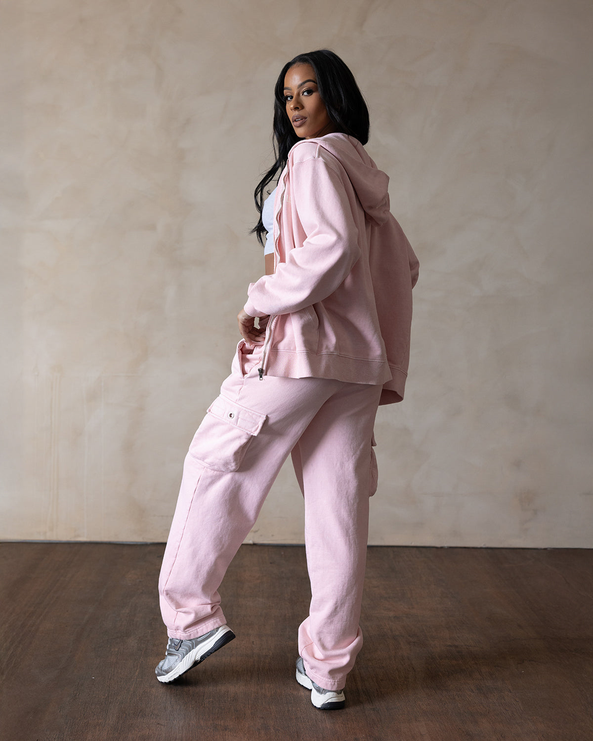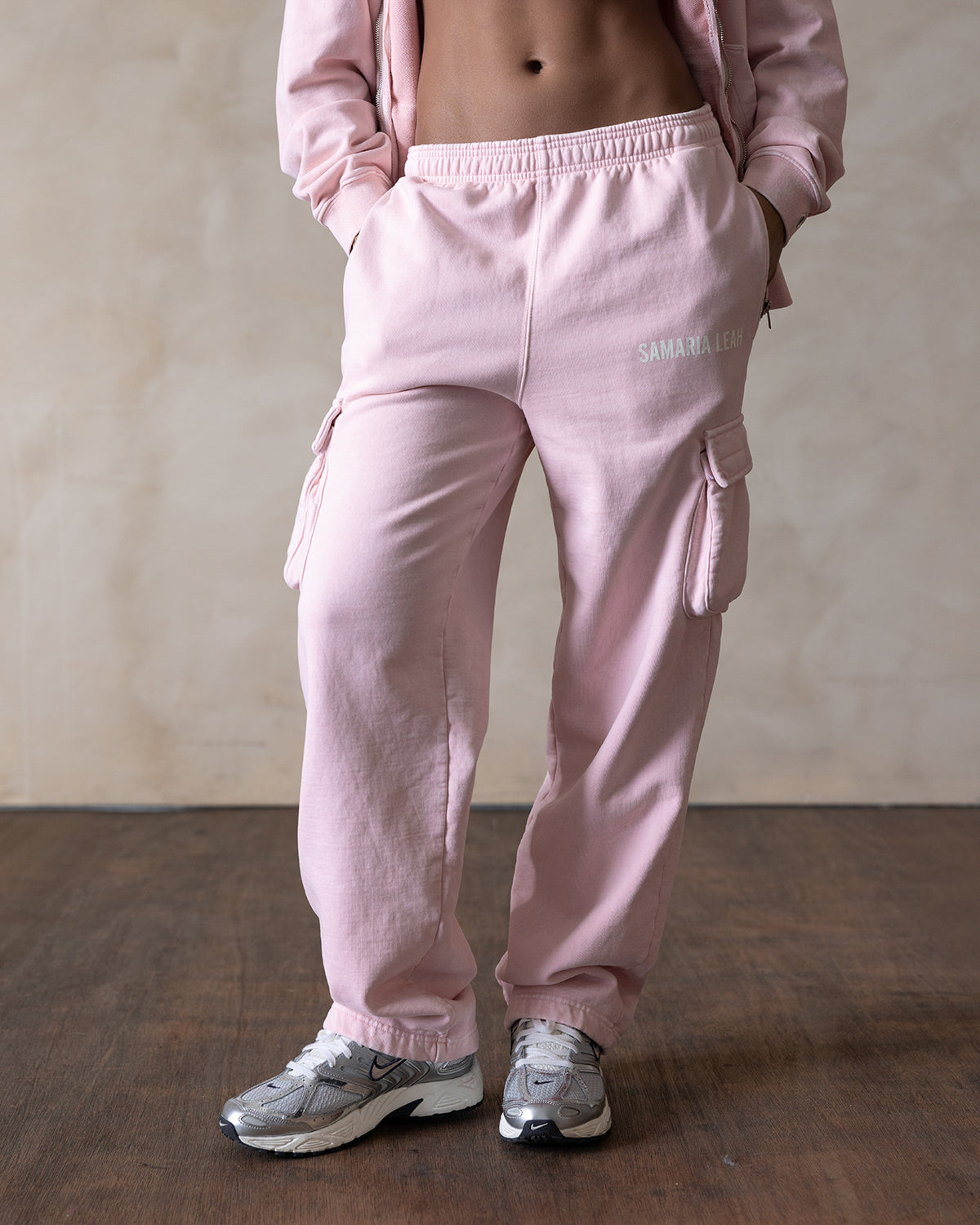 The sl logo sweats in 'shortcake' feature oversized cargo pockets with a straight leg and a relaxed fit. Hand dyed to a vintage baby pink. This style is perfect for those who are taller or prefer a longer inseam.