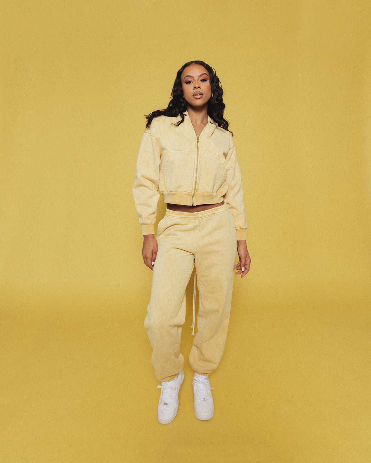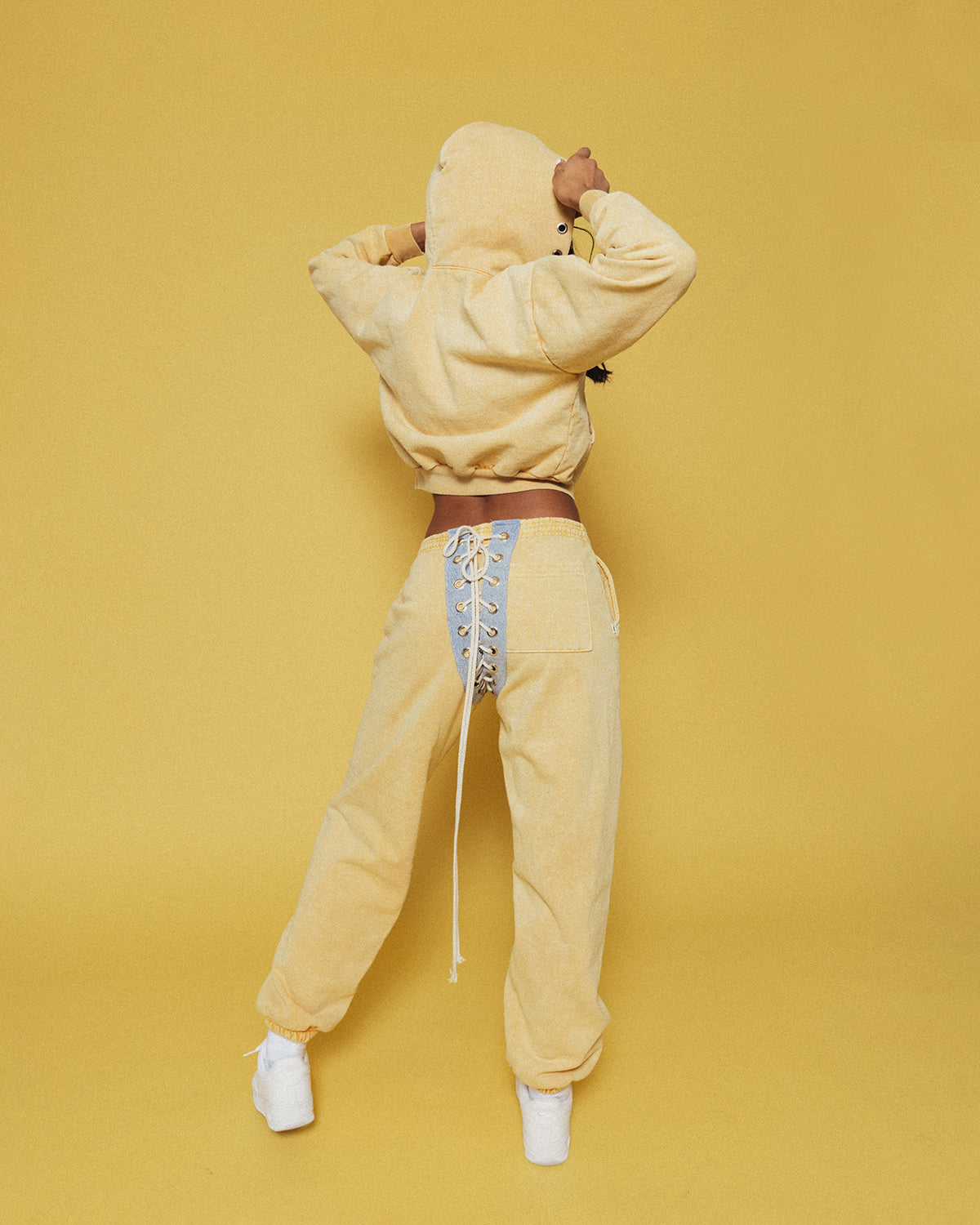 Our best selling Nicki sweats in seasonal color-way 'Banana'. A yummy, mellow yellow. Wash of denim will vary.