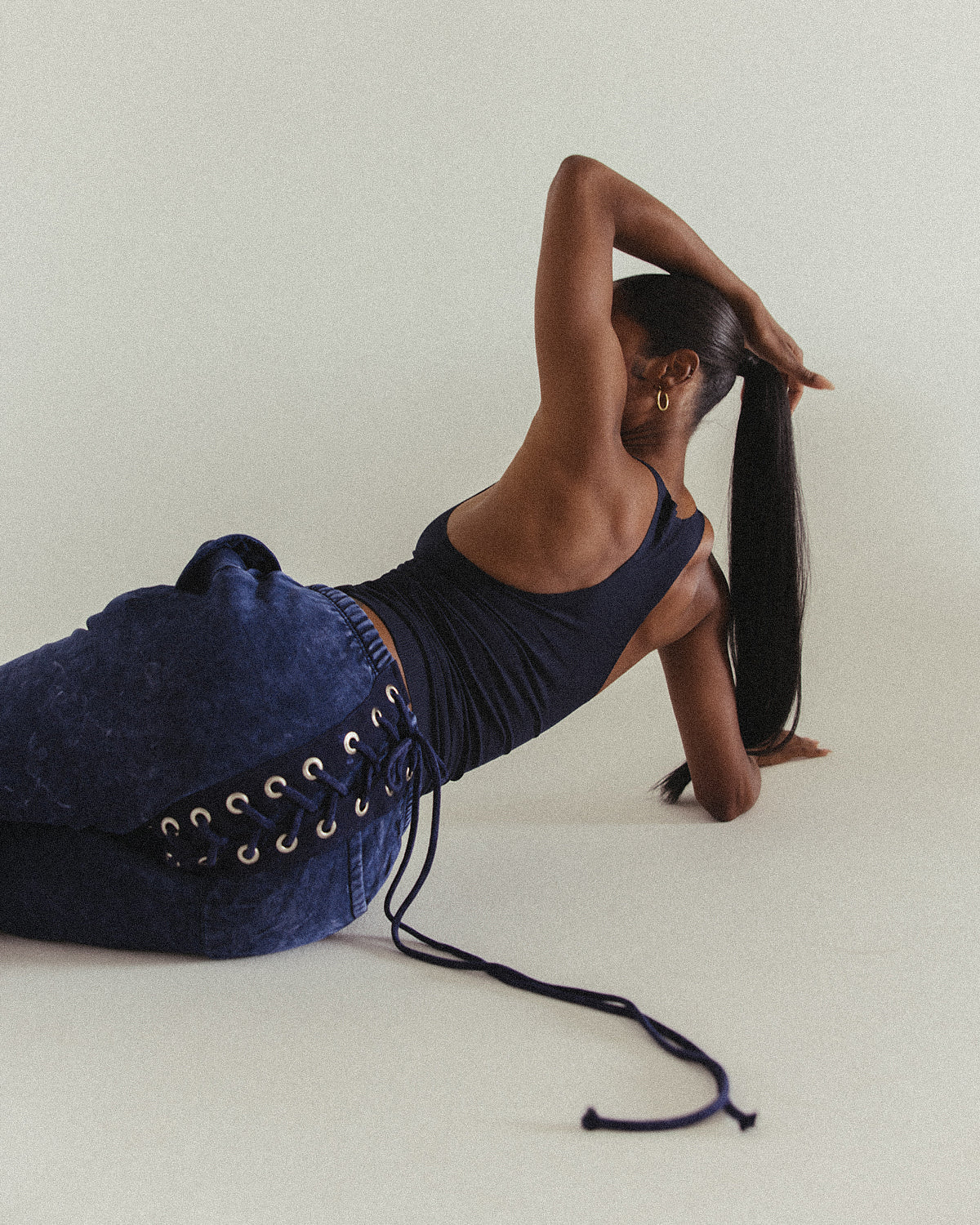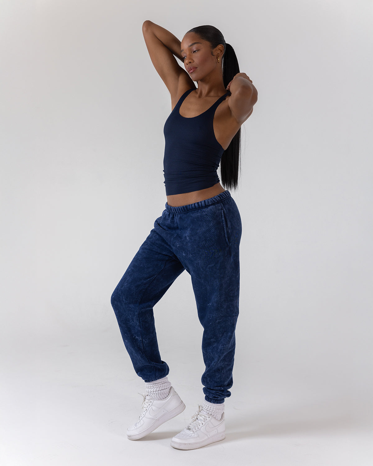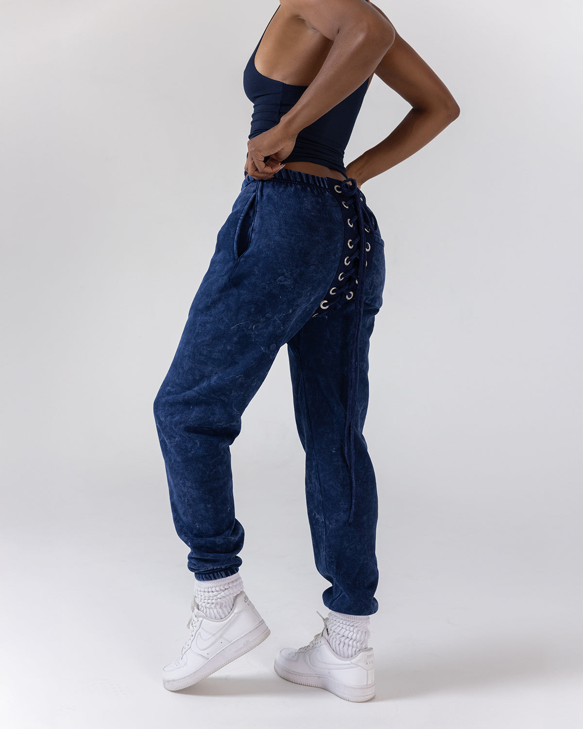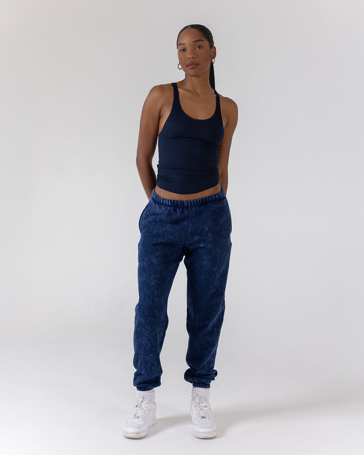 Our classic Nicki sweats feature the signature lace up grommet detail along the butt. 'Blueberry' is a vintage washed, navy blue with matching cording. Pair with the matching sl tank.